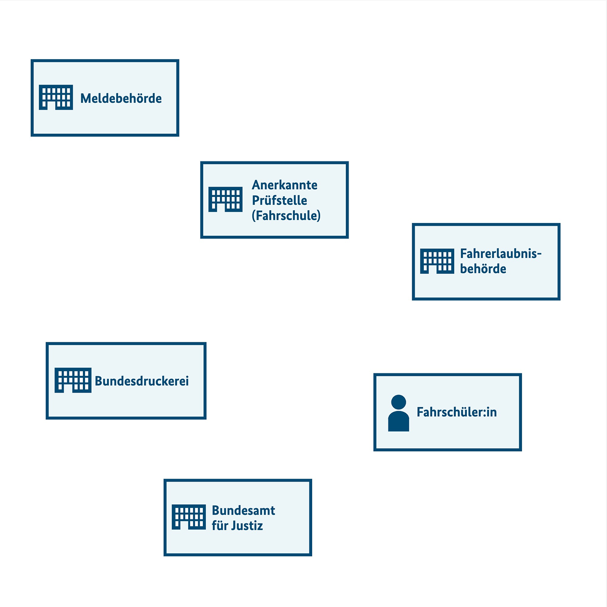 Eine Grafik, welches die Institutionen Meldebehörde, Anerkannte Prüfstelle (Fahrschule), Bundesdruckerei, Bundesamt für Justiz sowie die Rolle Fahrschüler:in ungeordnet darstellt.