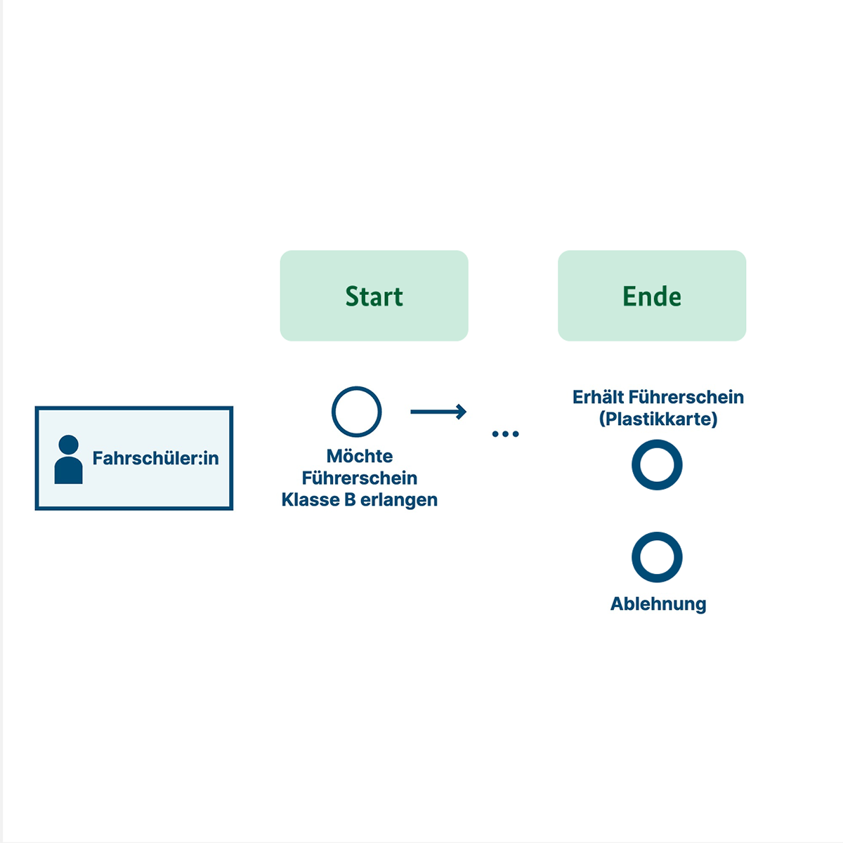 Ausschnitt eines Flussdiagramms: Start des Prozesses durch einen Kreis mit dünner Linie für den Akteur Fahrschüler:in. Zwei dick umrandete Kreise zeigen verschiedene mögliche Endergebnisse.
