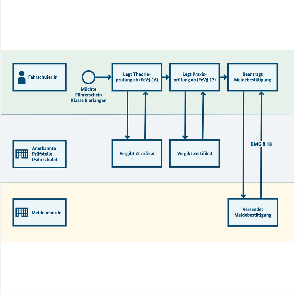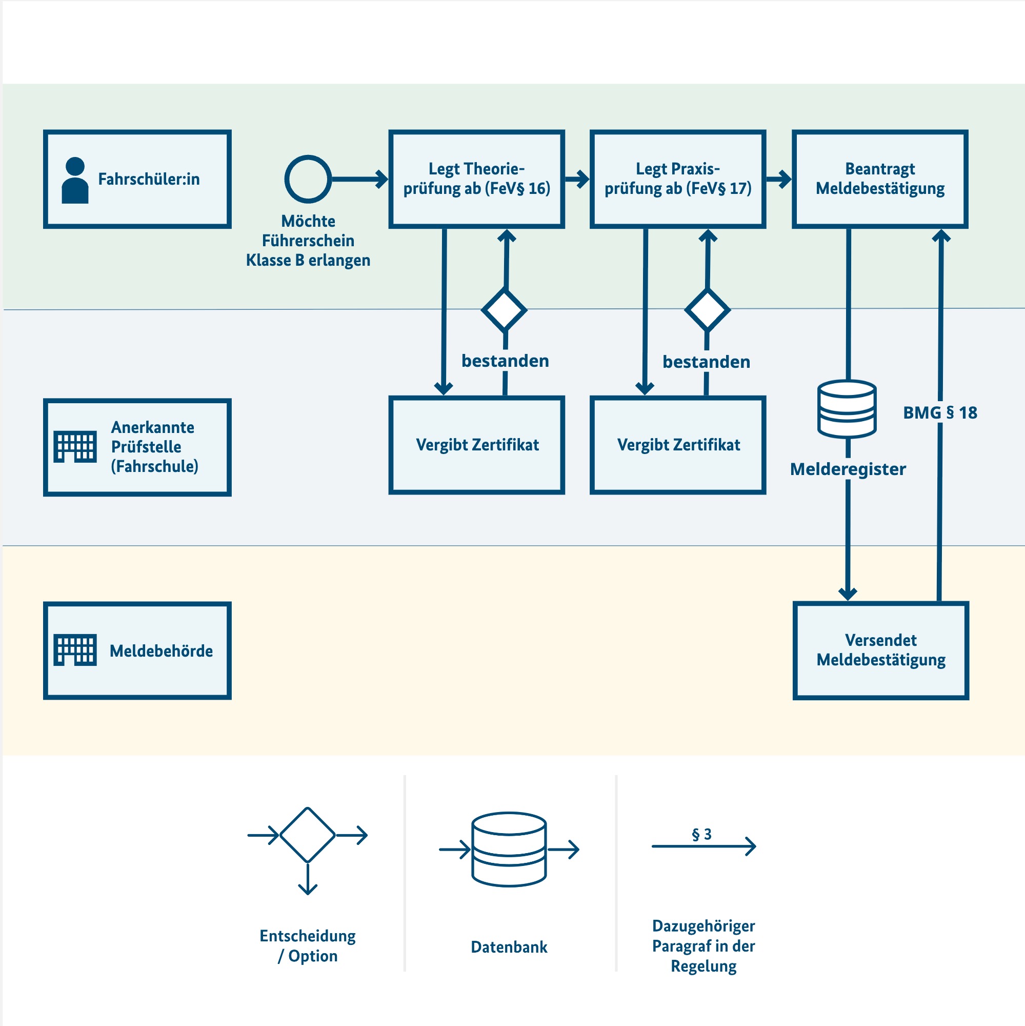 Flussdiagramm, welches Aktivitäten für Akteure Fahrschüler:in, Anerkannte Prüfstelle (Fahrschule) sowie Meldebehörde in farblich unterschiedlich kodierten Schwimmbahnen wie im Text beschrieben darstellt.