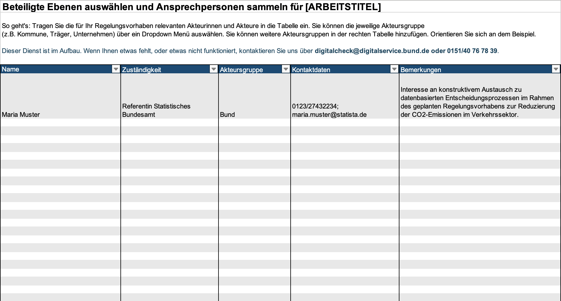 ![Eine Excel-Tabelle mit dem Titel "Beteiligte Ebenen auswählen und Ansprechpersonen sammeln für [ARBEITSTITEL]" enthält Spalten für Name, Zuständigkeit, Akteursgruppe, Kontaktdaten und Bemerkungen. Der erste Eintrag listet als Beispiel "Maria Muster" als Referentin für das Statistische Bundesamt, zugehörig zur Akteursgruppe "Bund" mit ihren Kontaktdaten.](/images/ebenen-auswaehlen-und-ansprechpersonen-sammeln.png)